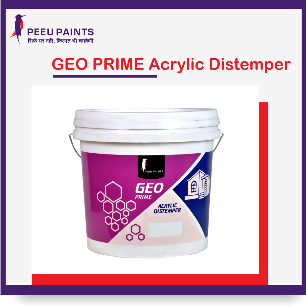 GEO PRIME Acrylic Distemper is a _ 100% water-based acrylic copolymer emulsion designed for interior walls and use also exterior walls, acrylic distemper a pocket-friendly price.